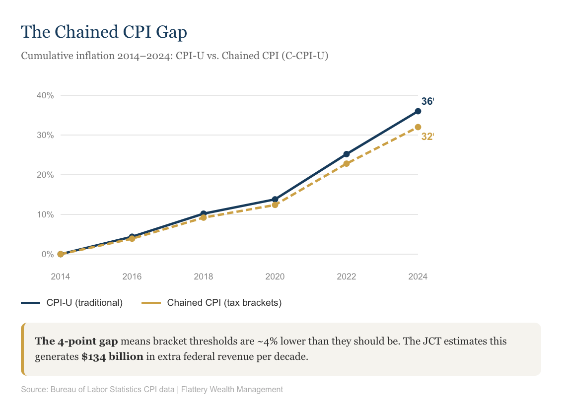 And here is the kicker. The switch to Chained CPI was one of the few permanent provisions in the TCJA. Even when the individual rate cuts were scheduled to sunset, this stayed. The One Big Beautiful Bill Act (OBBBA), signed July 4, 2025, retained it permanently. This mechanism will keep compounding for decades.